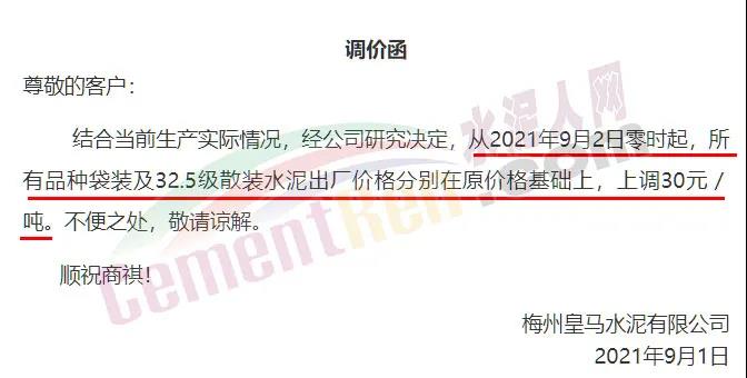 梅州皇馬水泥有限公司通知,從2021年9月2日零時起,所有品種袋裝及32.5級散裝水泥出廠價格分別在原價格基礎上上調30元/噸。