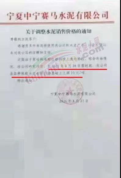 另據消息稱,寧夏區域多家品牌企業也于近日上調了水泥價格。寧夏吳忠賽馬新型建材有限公司通知 ,由于原材料采購價格持續上漲的原因,結合市場情況經公司研究決定 ,自2021年8月28日零時起,公司各品種規格水泥在原價基礎上上調20元/噸。
