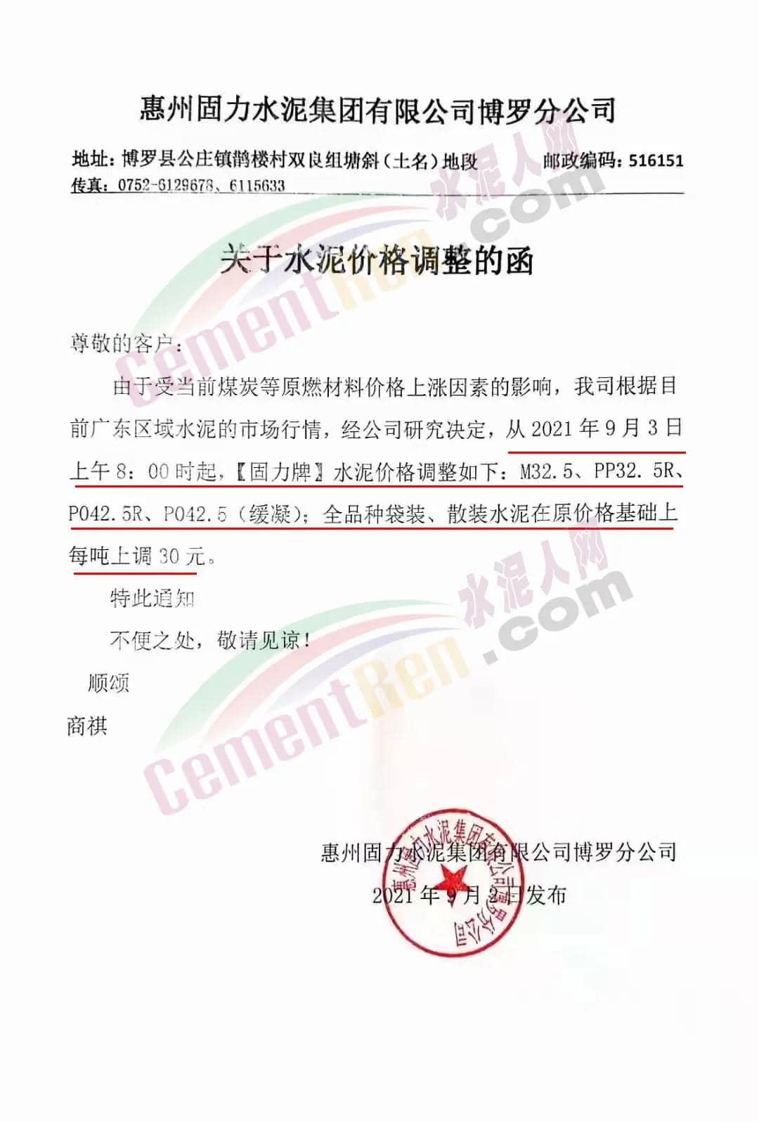 惠州固力水泥集團有限公司分公司通知,受當前煤炭等原燃材料價格上漲因素的影響,公司根據目前廣東區域水泥的市場行情決定,從2021年9月3日上午8時起,“固力牌”M32.5、PP32.5R、PO42.5R、PO42.5(緩凝);全品種袋裝、散裝水泥在原價格基礎上上調30元/噸。