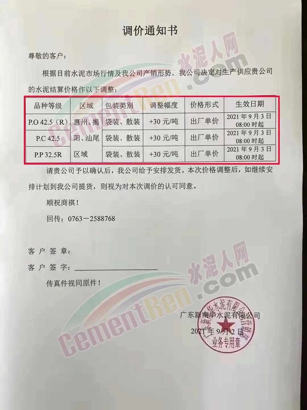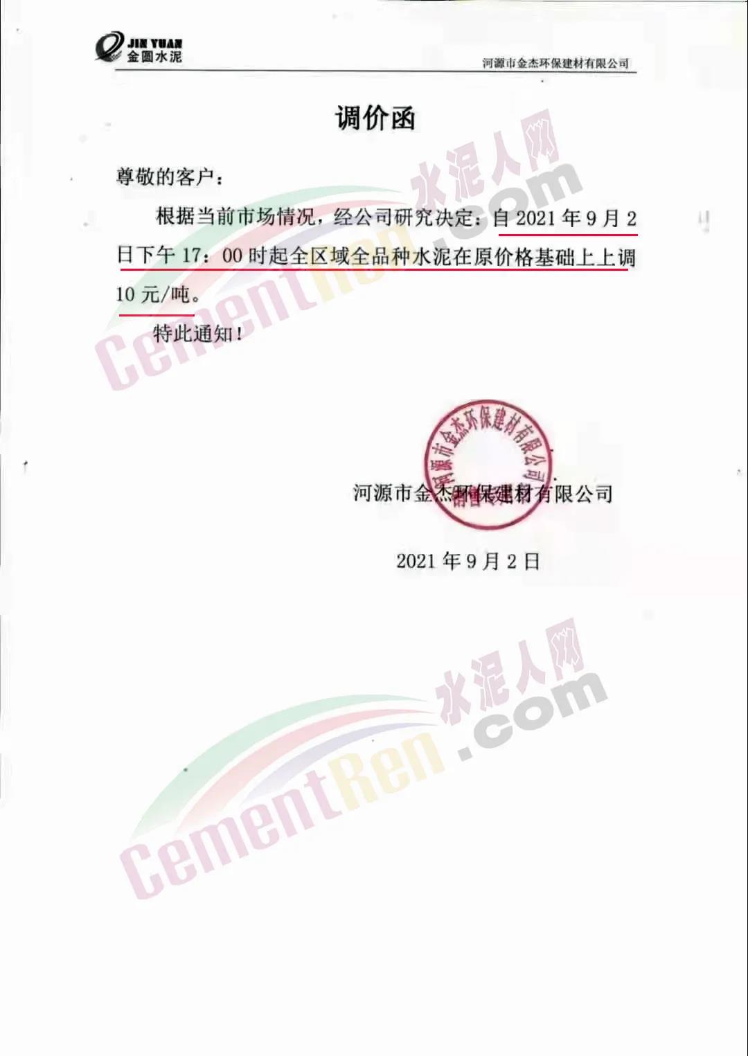 河源市金杰環保建材有限公司通知,根據當前市場情況,經公司研究決定自 2021年9月2日下午17時起全區域全品種水泥在原價格基礎上上調10元/噸。