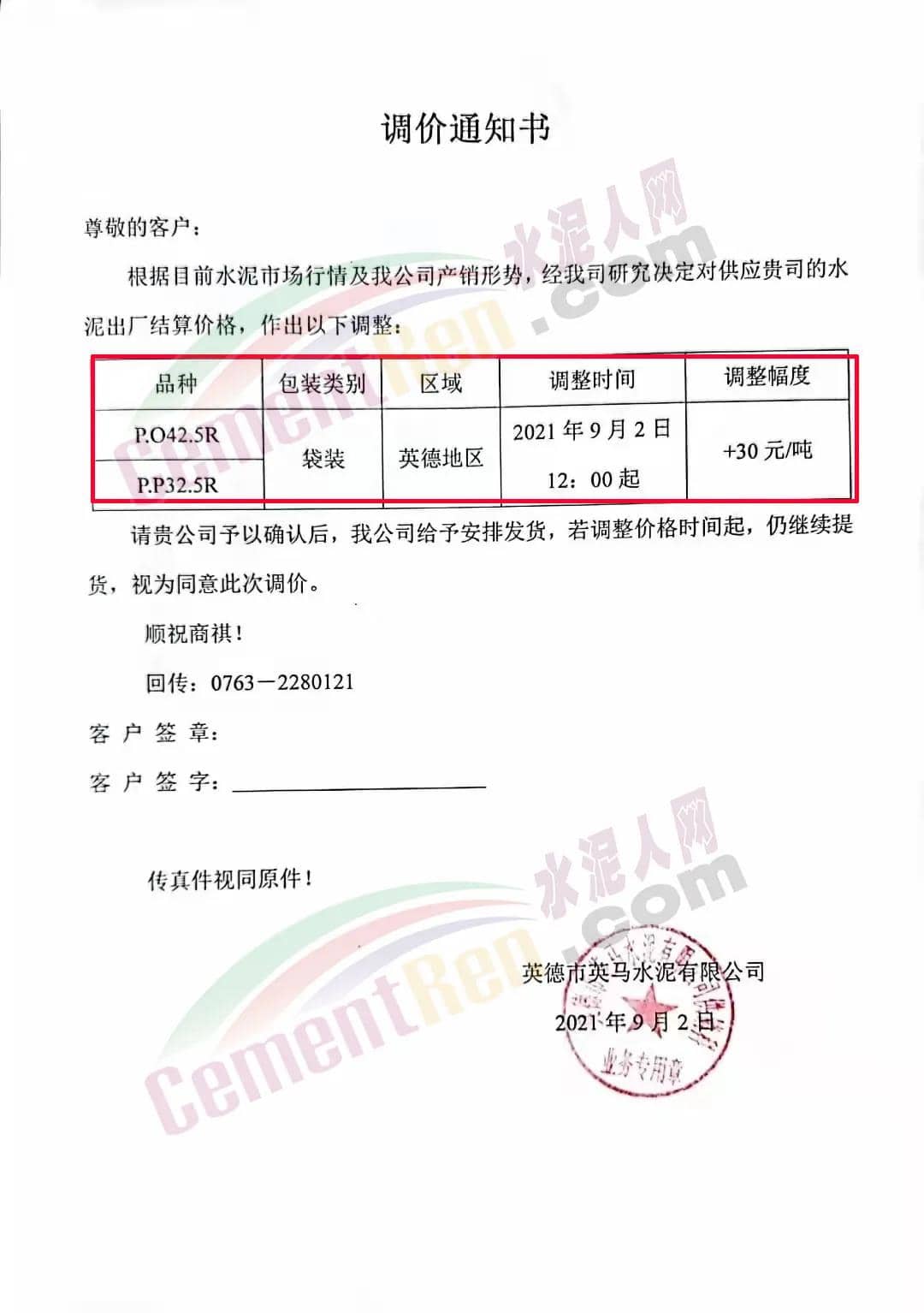 由于受各種原材料價格上升的影響,公司根據目前水泥的市場行情,經研究決定從2021年9月2日下午18時起,公司供應的PP32.5R包裝、散裝在原價的基礎上上調10元/噸。PO42.5R散裝在原價的基礎上上調10元/噸。