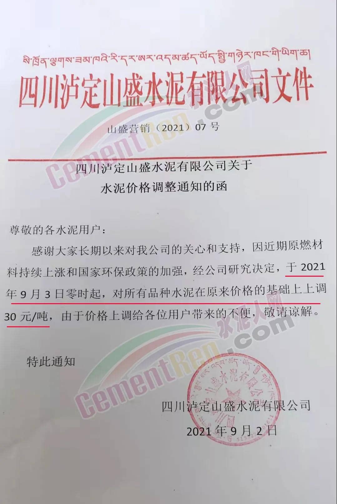 四川瀘定山盛水泥有限公司通知,因近期原燃材料持續上漲和國家環保政策的加強,經公司研究決定,于2021年9月3日零時起,對所有品種水泥在原來價格的基礎上上調30元/噸。