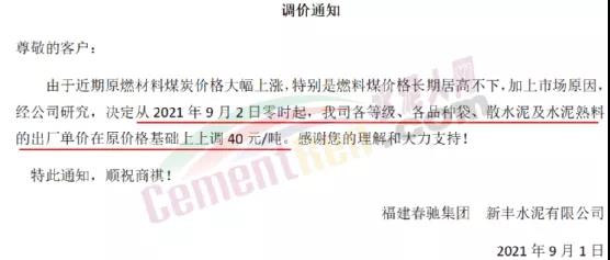 福建春馳集團新豐水泥有限公司通知由于近期原燃材料煤炭價格大幅上漲,特別是燃料煤價格長期居高不下,加上市場原因,經公司研究,決定從2021年9月2日零時起,公司各等級、各品種袋、散水泥及水泥熟料的出廠單價在原價格基礎上上調40元/噸。