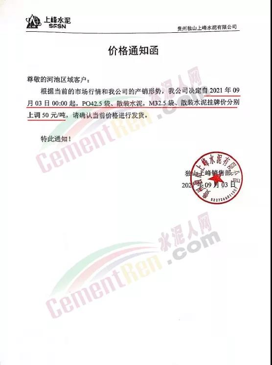 貴州獨山上峰水泥有限公司通知,根據當前的市場行情和公司的產銷形勢,公司決定自2021年9月3日0時起,PO42.5袋、散裝水泥,M32.5袋、散裝水泥掛牌價分別上調50元/噸。