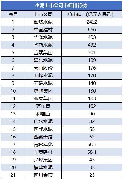 從上述榜單來看,截至9月6日晚間收盤時,總市值超過1000億的水泥企業(yè)只有一家——海螺水泥。而排名前五的水泥企業(yè)分別是:海螺水泥2422億、中國建材866億、華潤水泥493億、華新水泥492億、金隅集團401億。