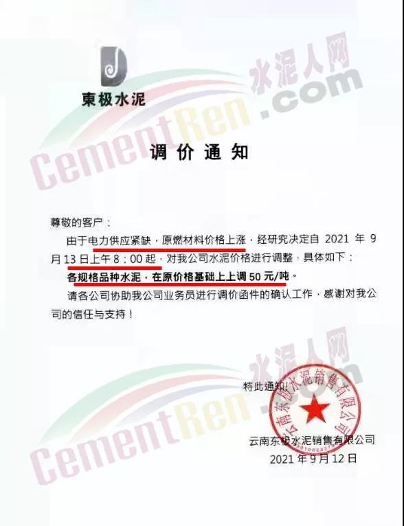 宜良縣永興水泥有限公司通知,自9月13日7時起,對各規(guī)格型號水泥出廠價上調(diào)50元/噸。