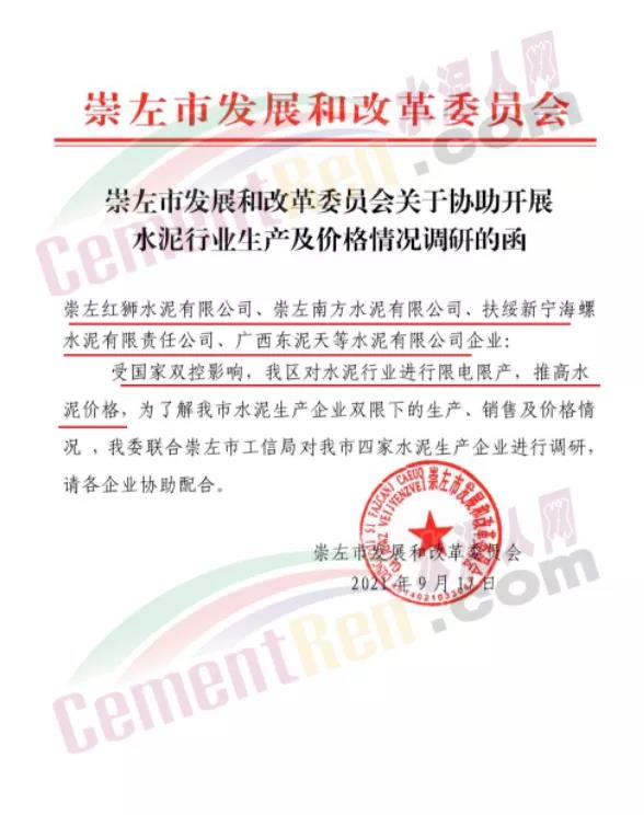 近日,崇左市發改委發調研函給轄區內紅獅、南方、海螺、東泥天等等水泥企業稱,受國家雙控影響,廣西壯族自治區對水泥行業進行限電限產,推高水泥價格,為了解崇左市水泥企業雙限下的生產、銷售及價格情況,崇左市發改委聯合崇左市工信局將對區域內四家水泥生產企業進行調研。