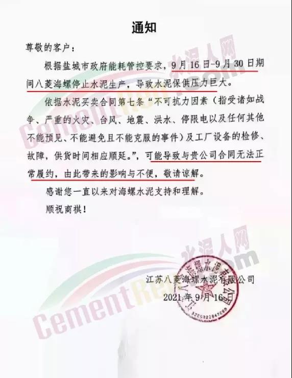 據水泥人網此前消息,9月16日八菱海螺發通知稱,根據江蘇省鹽城市政府能耗管控要求,9月16日-9月30日期間八菱海螺停止水泥生產,導致水泥保供壓力巨大。不可抗力因素可能導致與貴公司合同無法正常履約。