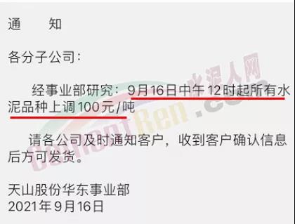 天山股份華東事業部通知,9月16日中午12時起所有水泥品種上調100元/噸。