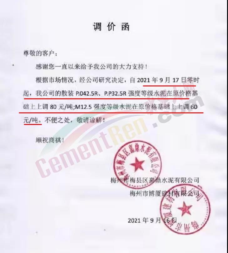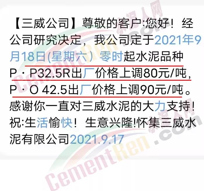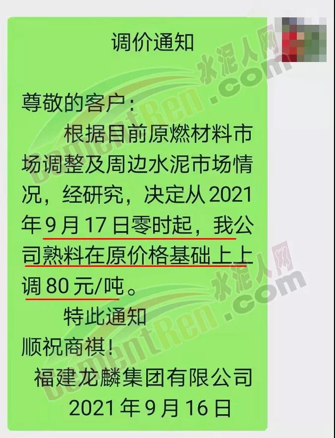 根據當前市場行情,我司決定自2021年9月18日零時起,上調三明區域各品種袋、散水泥價格80元/噸。特此通知!