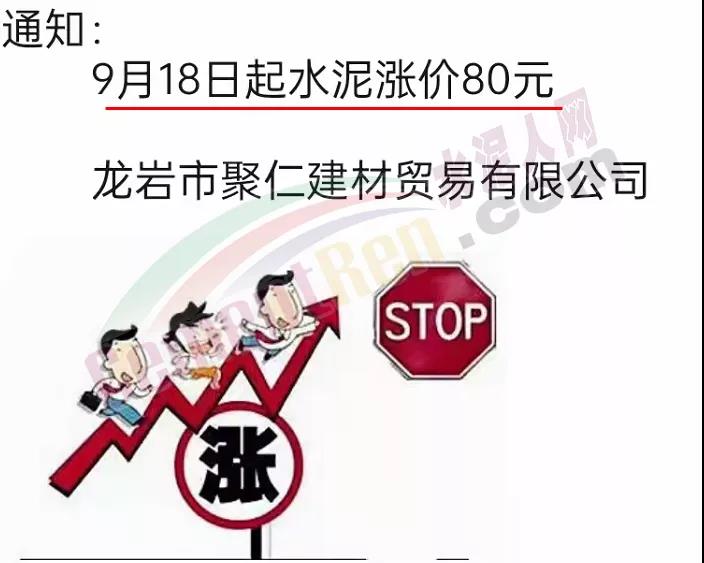 龍巖市聚仁建材貿易有限公司通知,9月18日起水泥漲價80元/噸。