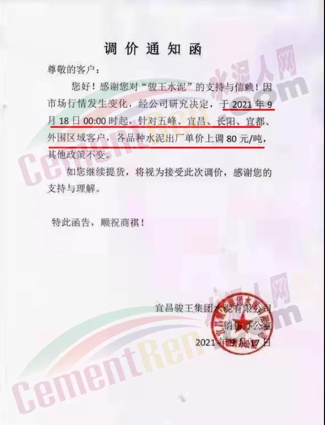 湖北宜昌駿王集團通知9月18日0時起,針對五峰、宜昌、長陽、宜都外圍區域客戶,各品種水泥出廠單位上調80元/噸。