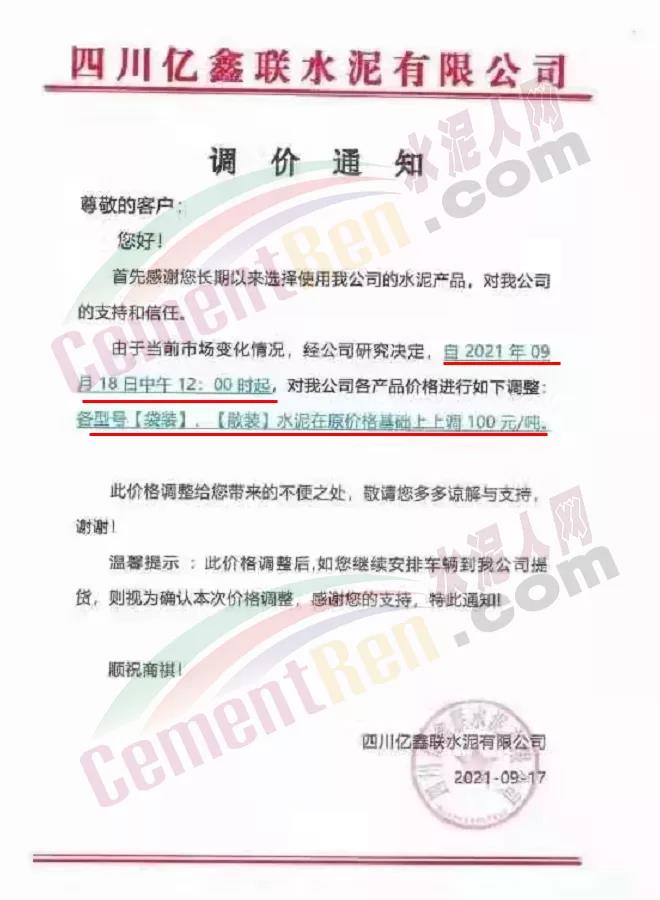 四川億鑫聯水泥通知,9月18日中午12時起,各標號水泥上調100元/噸。
