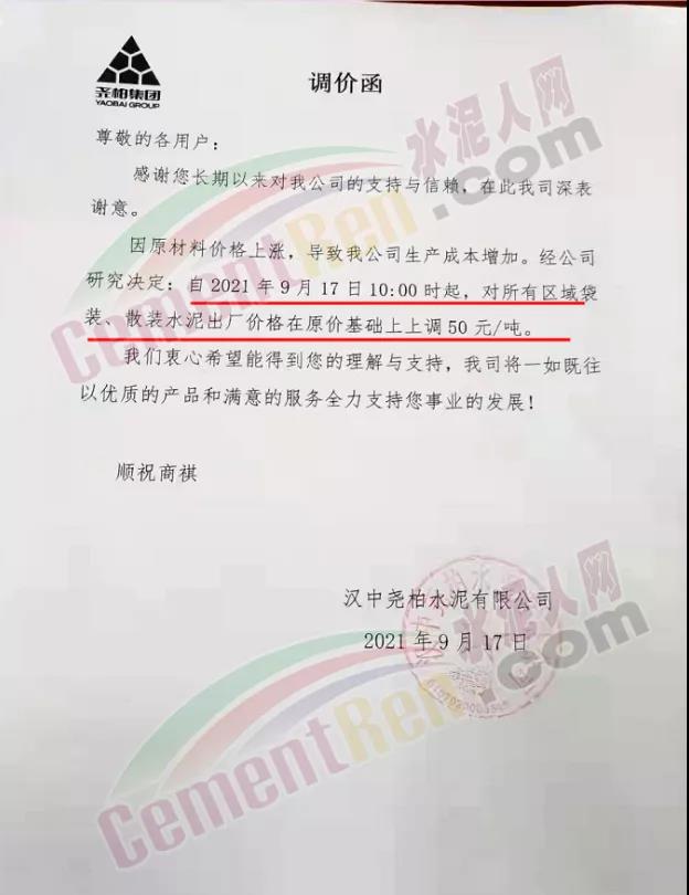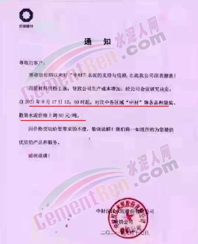 中材漢江水泥通知,自9月17日12時起對漢中各區域“中材”牌各品種水泥上調50元/噸。