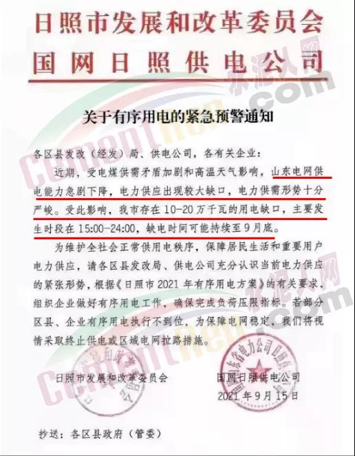?日照市發展和改革委員會國網日照供電公司發布《關于有序用電的緊急預警通知》稱,近期,受電煤供需矛盾加劇和高溫天氣影響,山東電網供電能力急劇下降,電力供應出現較大缺口,電力供需形勢十分嚴峻。受此影響,日照市存在10-20萬千瓦的用電缺口,主要發生時段在15∶00-24∶00,缺電時間可能持續至9月底。