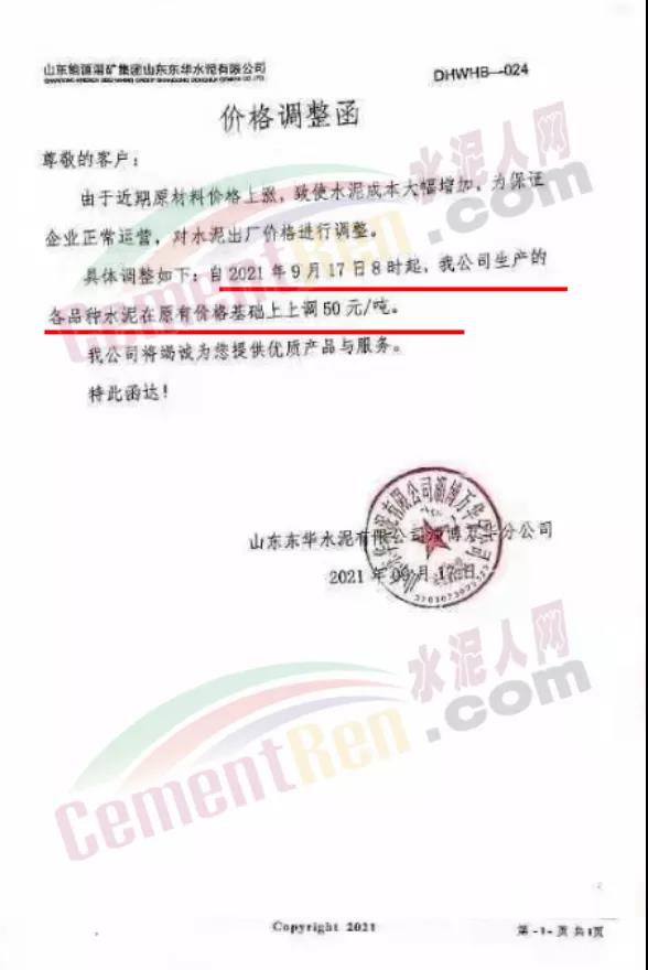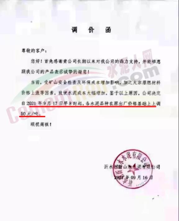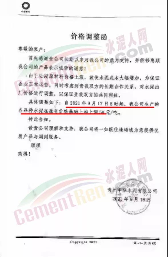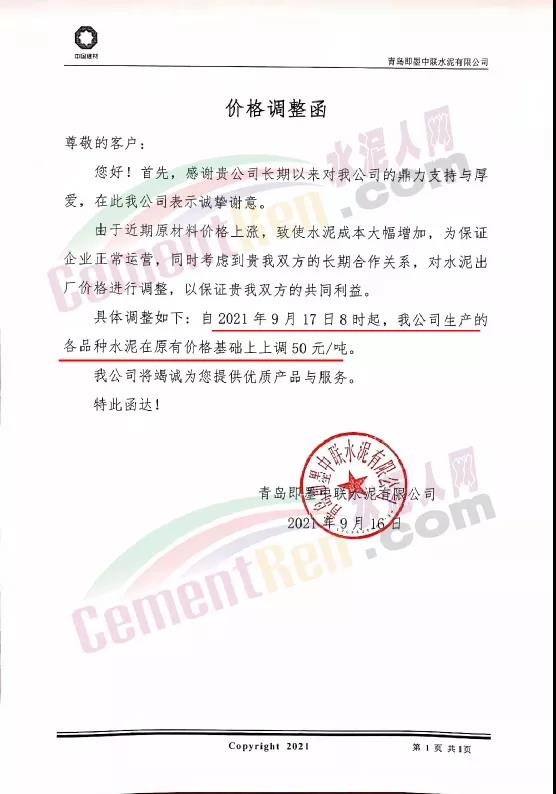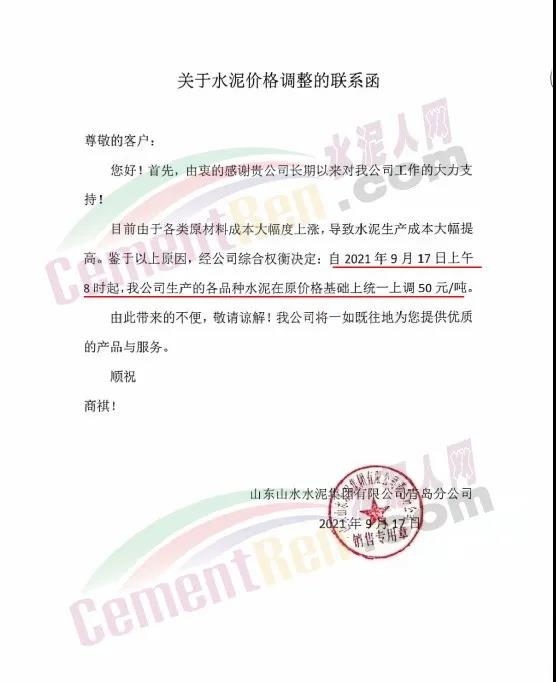 青島即墨中聯水泥有限公司通知,由于近期原材料價格上漲,致使水泥成本大幅增加,為保證企業正常運營,自2021年9月17日8時起,公司生產的各品種水泥在原有價格基礎上上調50元/噸。