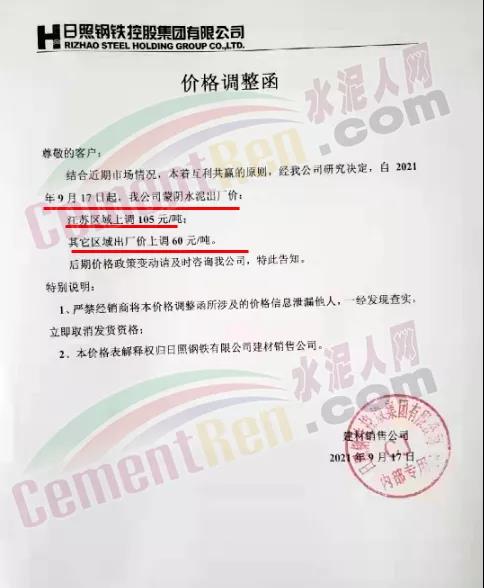 日照鋼鐵控股集團有限公司建材銷售公司通知,結合近期市場情況,本著互利共贏的原則,經公司研究決定,自2021年9月17日起,公司散裝汽運水泥出廠價東港、嵐山上調60元/噸;莒縣、五蓮上調60元/噸∶臨沂區域上調60元/噸;青島區域上調60元/噸;連云港區域上調90元/噸∶濰坊區域上調10元/噸;江蘇區域上調105元/噸∶其他區域上調60元/噸;袋裝水泥上調60元/噸。