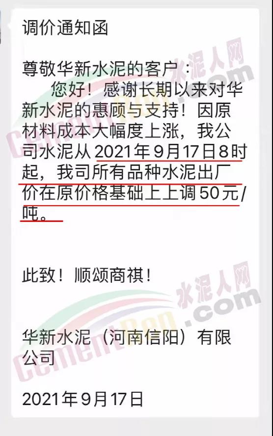 相關市場人士表示,山東漲價對河南區域也是個利好消息,華新水泥(河南信陽)有限公司通知因原材料成本大幅度上漲,公司水泥從2021年9月17日8時起,我司所有品種水泥出廠價在原價格基礎上上調50元/噸。