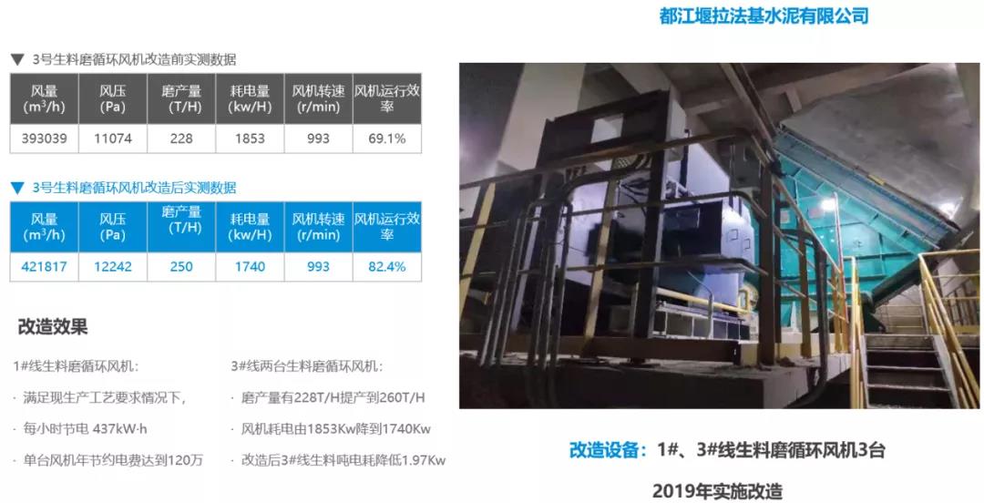 該項目于2021年實施改造,生料磨循環(huán)風機改造后同比運行功率下降937kW。