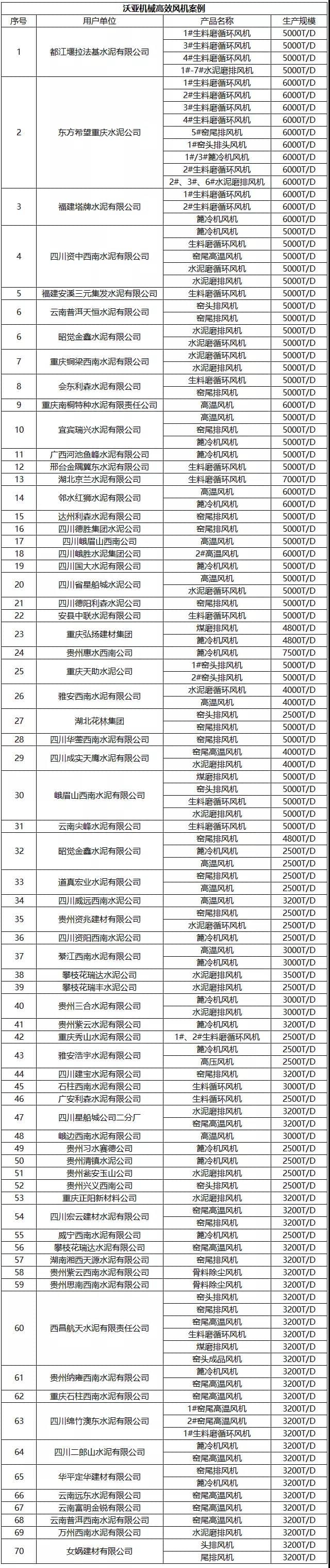 此外,沃亞機械還先后為金隅冀東水泥、東方希望、西南水泥、塔牌水泥、星船城水泥等多個大型水泥企業(yè)提供高效風機改造服務,在推動水泥行業(yè)綠色發(fā)展領域做出了突出貢獻。