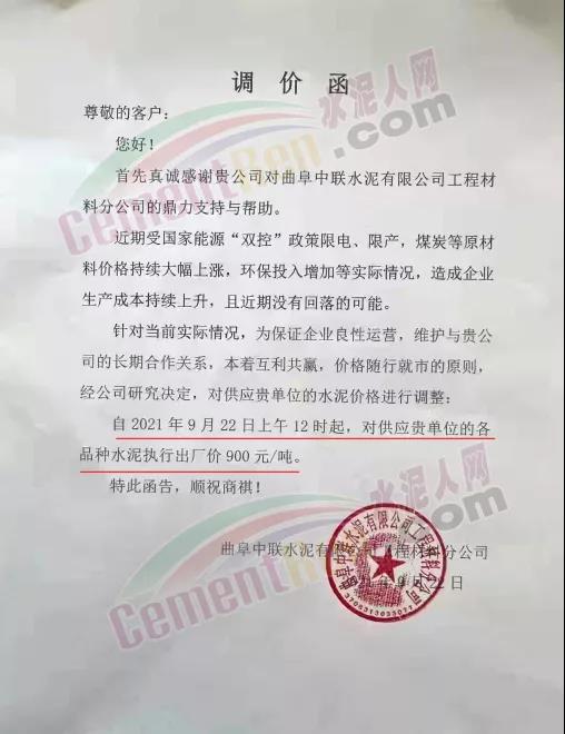 近日,曲阜中聯水泥有限公司工程材料分公司通知,近期受國家能源“雙控”政策限電、限產,煤炭等原材料價格持續大幅上漲,環保投入增加等實際情況,造成企業生產成本持續上升,且近期沒有回落的可能。針對當前實際情況,為保證企業良性運營,經公司研究決定,自2021年9月22日上午12時起,各品種水泥執行出廠價900元/噸。