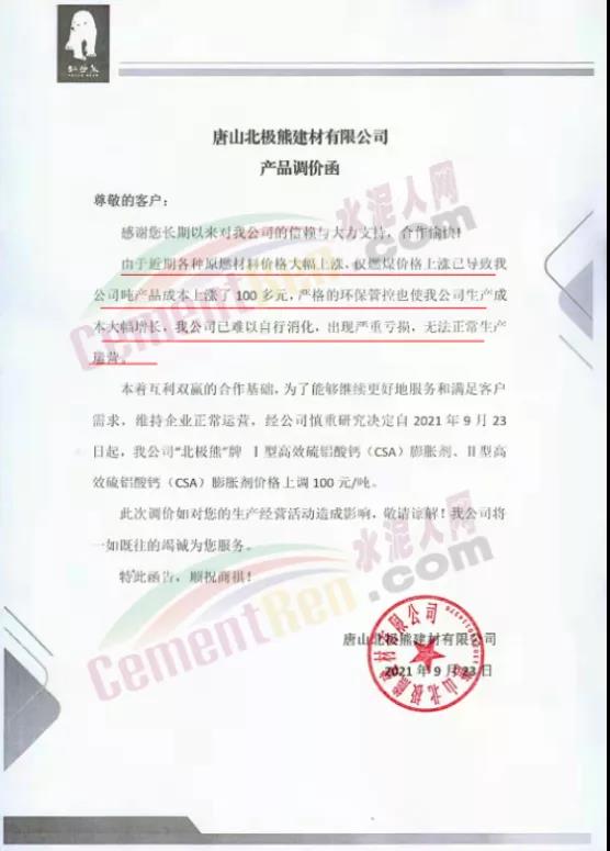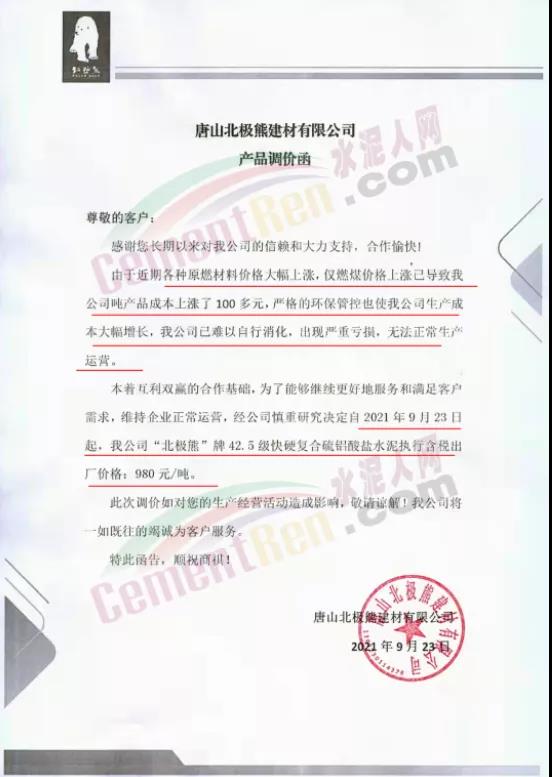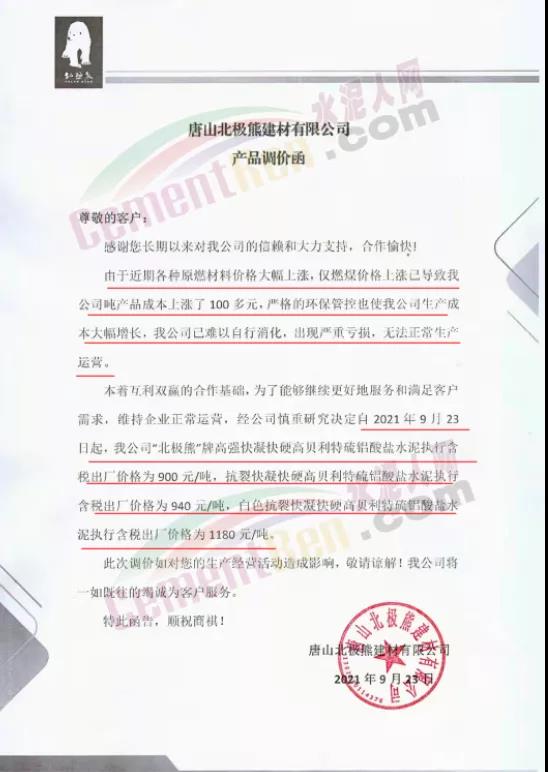 經公司慎重研究決定自2021年9月23日起,公司"北極熊"牌42.5級快硬復合硫鋁酸鹽水泥執行含稅出廠價格980元/噸;高強快凝快硬高貝利特硫鋁酸鹽水泥執行含稅出廠價格為900 元/噸;抗裂快凝快硬高貝利特硫鋁酸鹽水泥執行含稅出廠價格為 940元/噸;白色抗裂快凝快硬高貝利特硫鋁酸鹽水泥執行含稅出廠價格為1180 元/噸;Ⅰ型高效硫鋁酸鈣(CSA)膨脹劑、Ⅱ型高效硫鋁酸鈣(CSA)膨脹劑價格上調100元/噸。