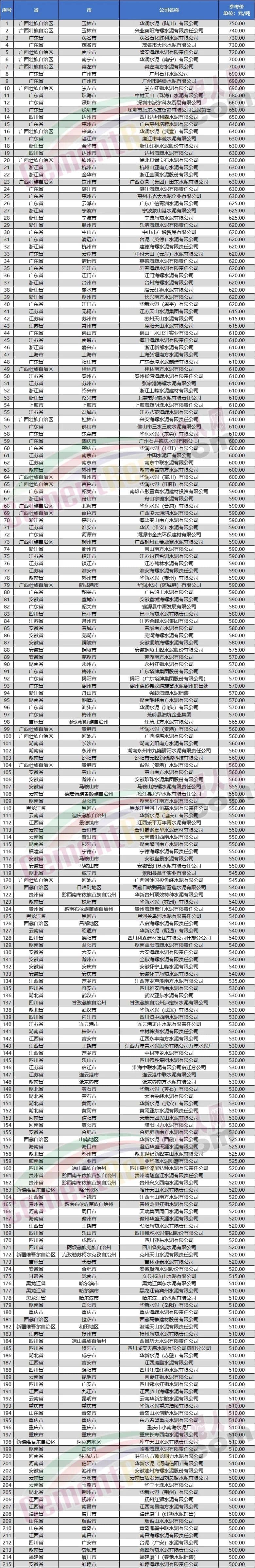 ?水泥人網信息中心重點監管的千余家水泥企業水泥價格數據顯示,有216家企業出廠參考價500元/噸及以上,有近一半的企業到位價在500元/噸及以上。