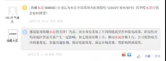 該消息一出,多位投資者在市公司平臺向海螺水泥提出相關區域的限電政策是否影響到了企業正常的生產,公司生產用煤炭是否存在供應缺口等問題。