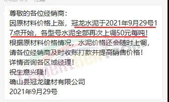 海南華裕茂供應鏈管理團限公司通知,根據目前市場形勢,經公司研究決定,自2021年9月30日零時起,公司從澄邁、三亞、儋州、昌江、瓊海、文昌、萬寧、五指山出廠的所有品種水泥,出廠價格在原有基礎上上調 50元/噸。