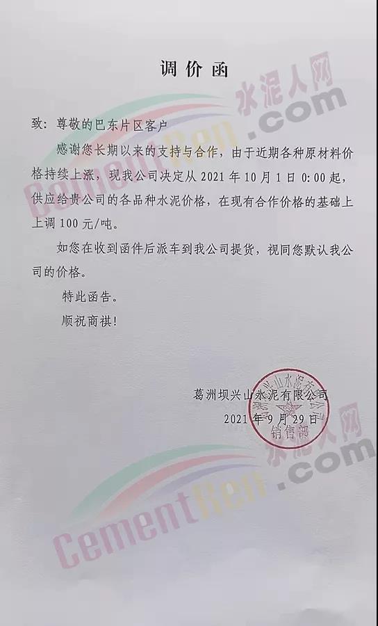 葛洲壩興山水泥有限公司通知,由于近期各種原材料價格持續上漲,現公司決定從2021年10月1日0∶00起,供應給貴公司的各品種水泥價格,在現有合作價格的基礎上上調100元/噸。