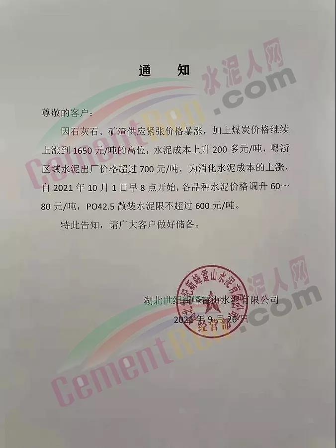 湖北世紀新峰雷山水泥有限公司通知,因石灰石、礦渣供應緊張價格暴漲,加上煤炭價格繼續上漲到1650元/噸的高位,水泥成本上升200多元/噸,粵浙區域水泥出廠價格超過700元/噸,為消化水泥成本的上漲,自2021年10月1日早8點開始,各品種水泥價格調升60~80元/噸,PO42.5散裝水泥限不超過600元/噸。