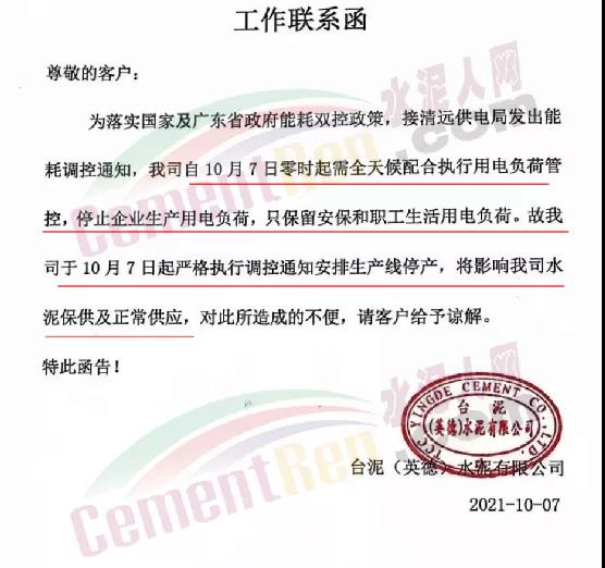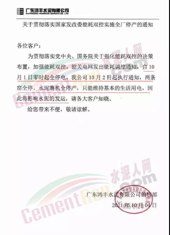 廣東鴻豐水泥有限公司通知為貫徹落實(shí)黨中央、國(guó)務(wù)院關(guān)于強(qiáng)化能耗雙控的決策布置,加強(qiáng)能耗雙控。韶關(guān)電網(wǎng)發(fā)出能耗調(diào)控通知,自10月1日零時(shí)起全停電。我公司10月2日起執(zhí)行通知,兩條窯全停、水泥磨機(jī)全停產(chǎn),只能維持基本的生活用電,因此將影響水泥的發(fā)運(yùn)。