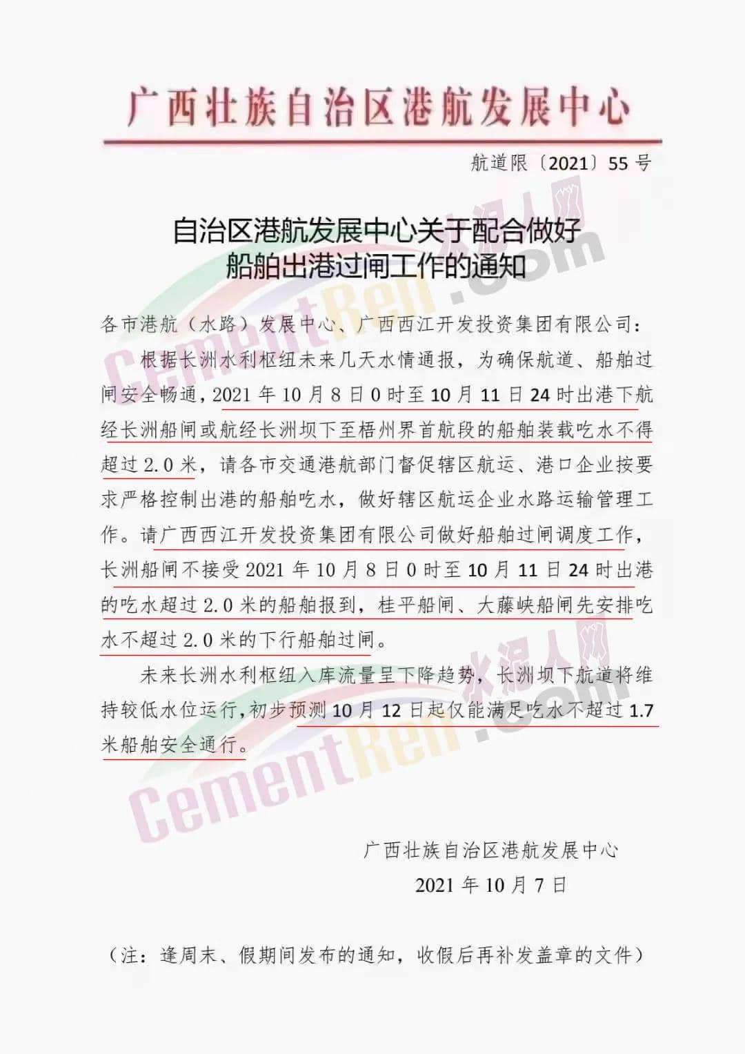 廣西壯族自治區(qū)港航發(fā)展中心發(fā)《自治區(qū)港航發(fā)展中心關(guān)于配合做好船舶出港過(guò)閘工作的通知》給各市港航(水路)發(fā)展中心、廣西西江開(kāi)發(fā)投資集團(tuán)有限公司稱(chēng),根據(jù)長(zhǎng)洲水利樞紐未來(lái)幾天水情通報(bào),為確保航道、船舶過(guò)閘安全暢通,2021年10月8日0時(shí)至10月11日24時(shí)出港下航經(jīng)長(zhǎng)洲船閘或航經(jīng)長(zhǎng)洲壩下至梧州界首航段的船舶裝載吃水不得超過(guò)2.0米,請(qǐng)各市交通港航部門(mén)督促轄區(qū)航運(yùn)、港口企業(yè)按要求嚴(yán)格控制出港的船舶吃水,做好轄區(qū)航運(yùn)企業(yè)水路運(yùn)輸管理工作。