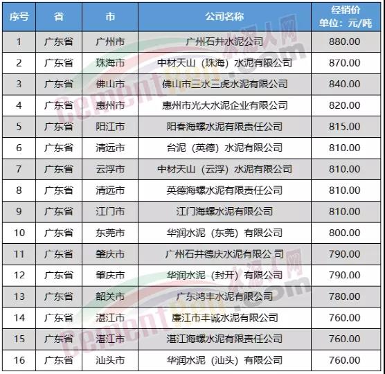 廣東省部分企業(yè)PO42.5散裝水泥參考報(bào)價(jià)