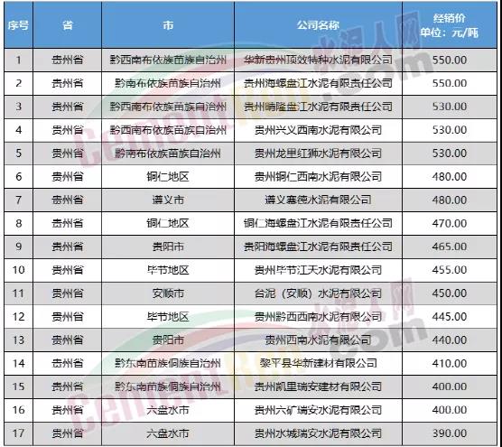 貴州省部分企業(yè)PO42.5散裝水泥參考報(bào)價(jià)