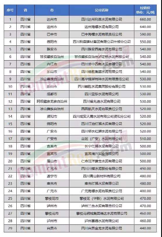 四川省部分企業(yè)PO42.5散裝水泥參考報(bào)價(jià)