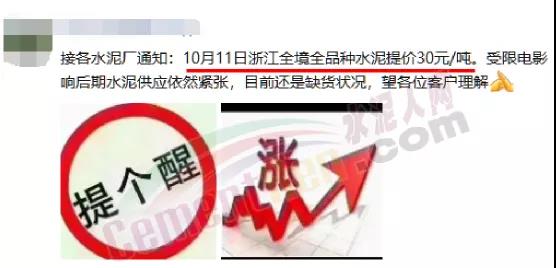 日前,浙江區域經銷商發消息稱,接各水泥廠通知10月11日浙江全境全品種水泥提價30元/噸。受限電影響水泥供應依然緊張,目前還是缺貨狀況。