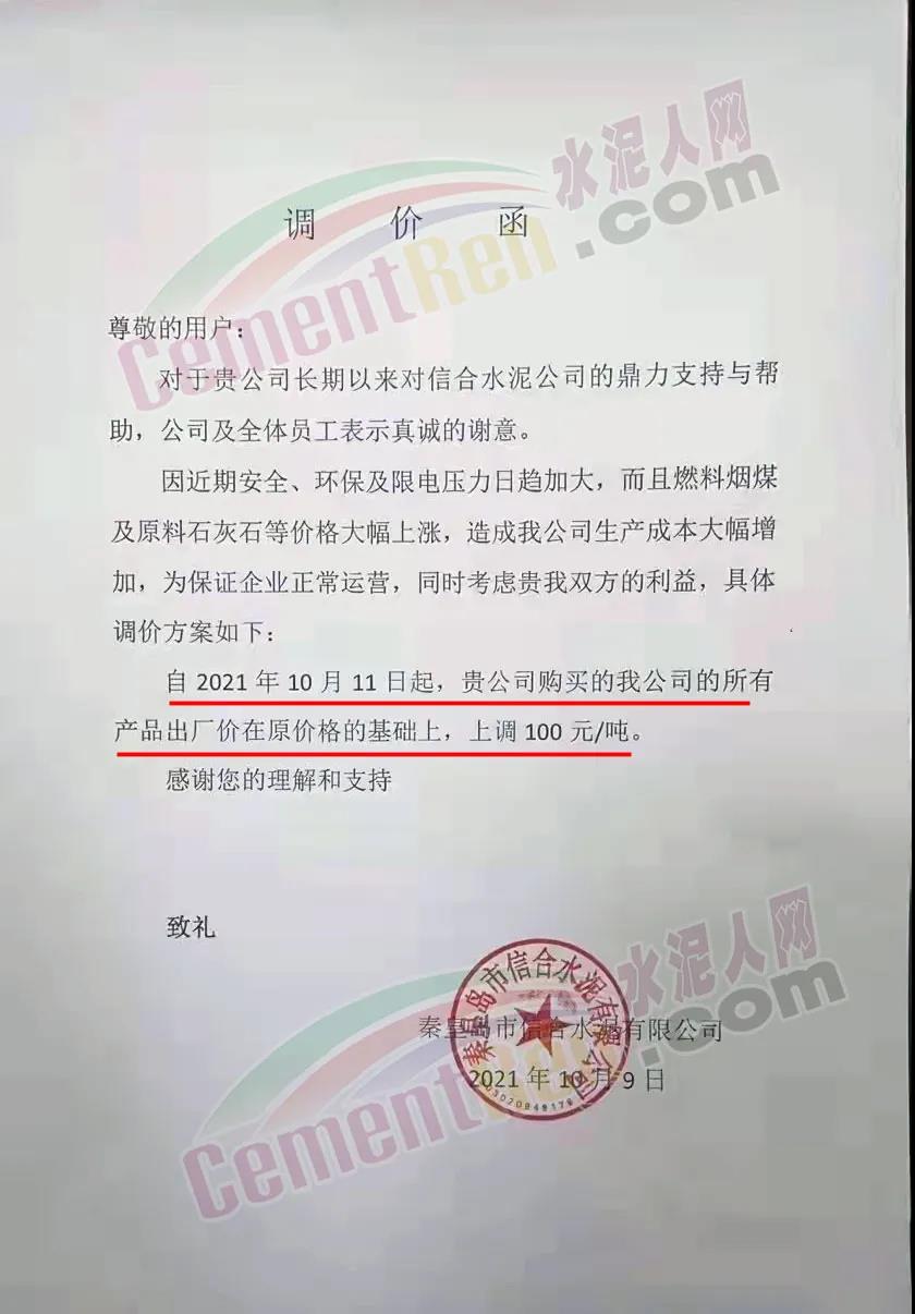 秦皇島信合水泥有限公司通知,因近期安全、環保及限電壓力日趨加大,而且燃料煙煤及原料石灰石等價格大幅上漲,造成公司生產成本大幅增加,為保證企業正常運營,自2021年10月11日起,公司的所有產品出廠價在原價格的基礎上,上調100元/噸。