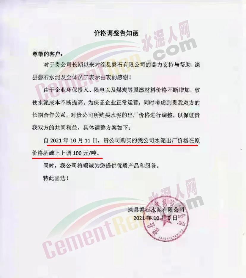 同日,北京金隅經貿公司通知,由于煤炭等原燃材料價格持續大幅上漲以及環保管控升級、限電等因素影響,致使公司水泥生產成本不斷提高。為保證企業的正常運營自2021年10月11日8時起,公司各品種水泥出廠價在原價格基礎上上調 100元/噸。