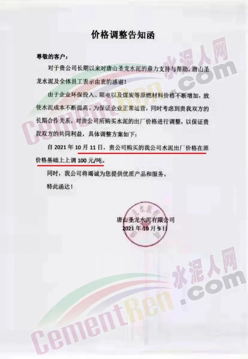 唐山圣龍水泥有限公司通知由于企業環保投入、限電以及煤炭等原燃材料價格不斷增加,致使水泥成本不斷提高。為保證企業正常運營,自2021年10月11日,公司水泥出廠價格在原價格基礎上上調100元/噸。