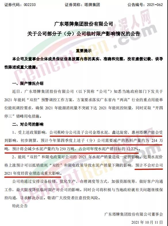 10月11日塔牌集團稱,近日,廣東塔牌集團股份有限公司知悉當地政府部門下發關于2021 年能耗“雙控”預警調控工作方案,方案要求落實廣東省內“兩高”行業的重點用能單位能耗調控要求,確保2021年能源消耗量不突破下達2021年能耗控制量,同時采取“開四停三”錯峰用電措施。