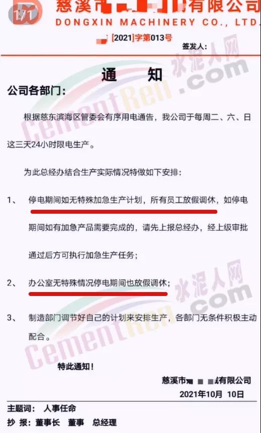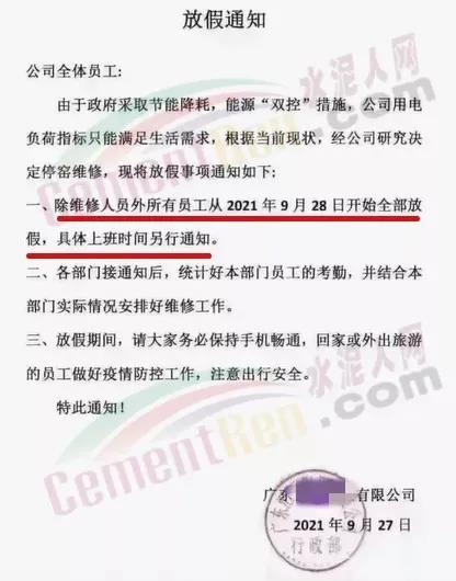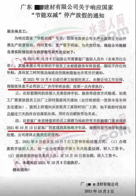 遼寧省工信廳發布《關于水泥行業熟料生產實施有序用電措施的通知》稱,水泥作為高耗能行業,其大負荷用電特性,已在現階段給電網安全穩定運行帶來隱患。經研究決定將全省水泥行業熟料生產用電列為第一序列實施有序用電。自2021年10月9日8時起,對全省水泥行業企業實施有序用電措施,期間水泥熟料生產停止用電。有序用電時間預計不低于15天,結束時間另行通知。對擅自啟動水泥熟料生產用電的企業,要責令改正,情節嚴重的停止供電。