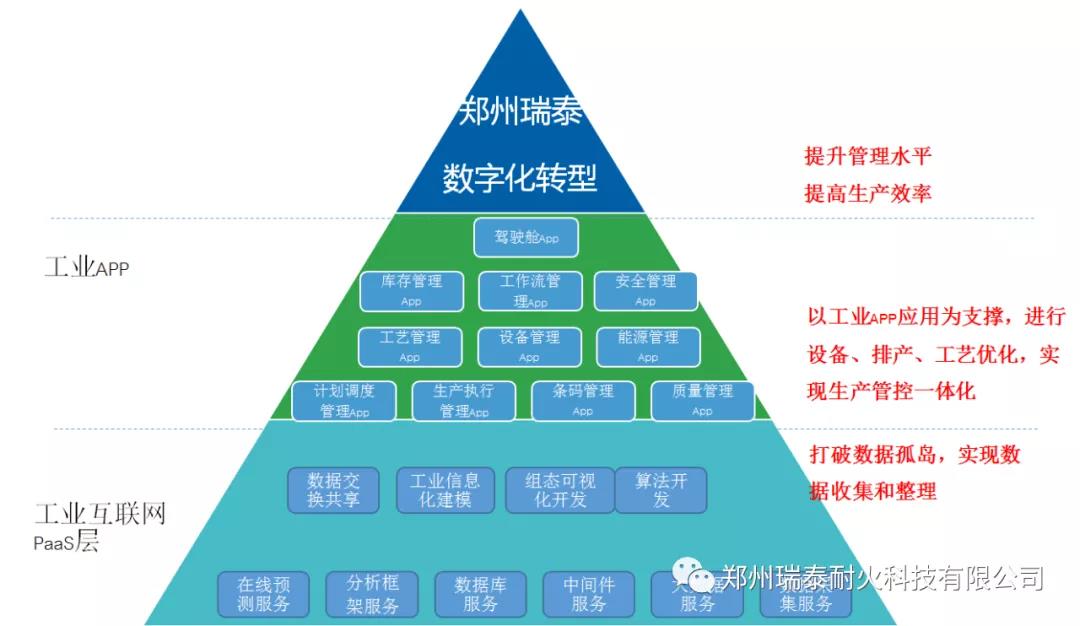 目前,鄭州瑞泰實現了耐火材料制造過程中的全部數字化管理與控制,包括生產計劃、作業派工、庫存等管理以及設備聯網、數據自動實時采集、工業大數據分析和現場看板化展示等。在生產過程中,從粉碎、配料、成型、燒成、檢測、包裝流程全面實現自動化、數字化、網絡化、智能化。