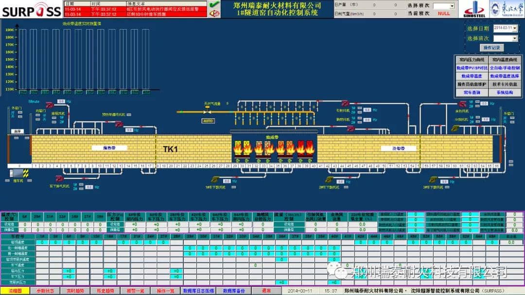 鄭州瑞泰在生產系統中采用MES系統,并實現與ERP、DCS、PLC等系統的集成運行。采用條碼管理系統,通過在PLM系統中使用,實現對產品全生命周期質量實時追溯。通過上線質量管理系統,產品質量信息可在線自動檢測、自動記錄。集控系統提供隧道窯、環保設備各項指標實時監測管理,具有數據采集、顯示、存儲、統計報表、打印、告警等功能。建立管控一體的中央控制室,主要用能設備實現實時監測與控制。創建軟硬件安全運行環境,確保網絡安全應急響應、實時恢復及安全可控。