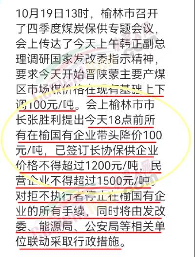 10月19日13時,榆林市召開了四季度煤炭保供專題會議,會上傳達了當日上午韓正副總理調研國家發改委指示精神,要求晉陜蒙主要產煤區市場煤價格在現有基礎上下調100元/噸。會上榆林市市長張勝利提出19日18點前所有在榆國有企業帶頭降價100元/噸,已簽訂長協保供企業價格不得超過1200元/噸,民營企業不得超過1500元/噸。對拒不執行者停止在榆國有企業的所有手續,同時將由發改委、能源局、公安局等相關單位聯動采取行政措施。
