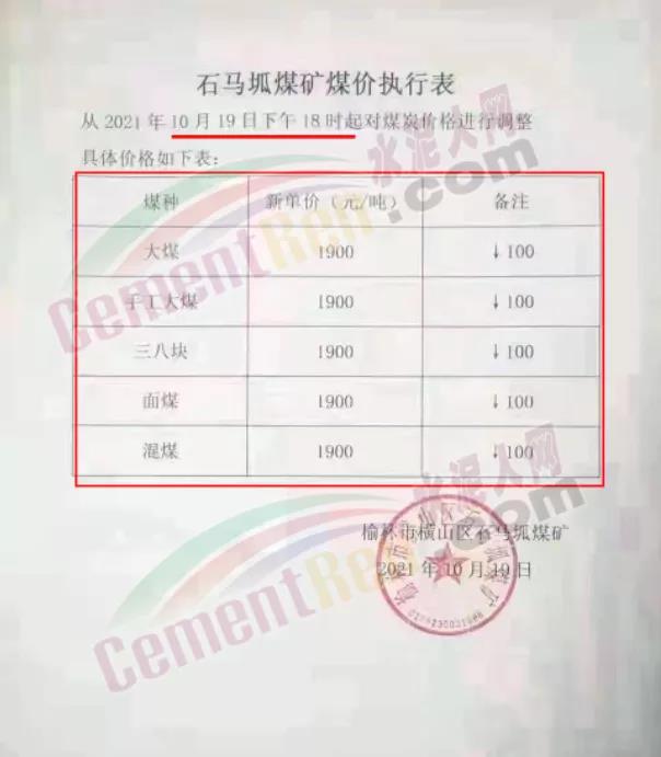 當日,榆林市橫山區石馬坬煤礦通知從2021年10月19日下午18時起對煤炭價格下調100元/噸,新單報價1900元/噸。