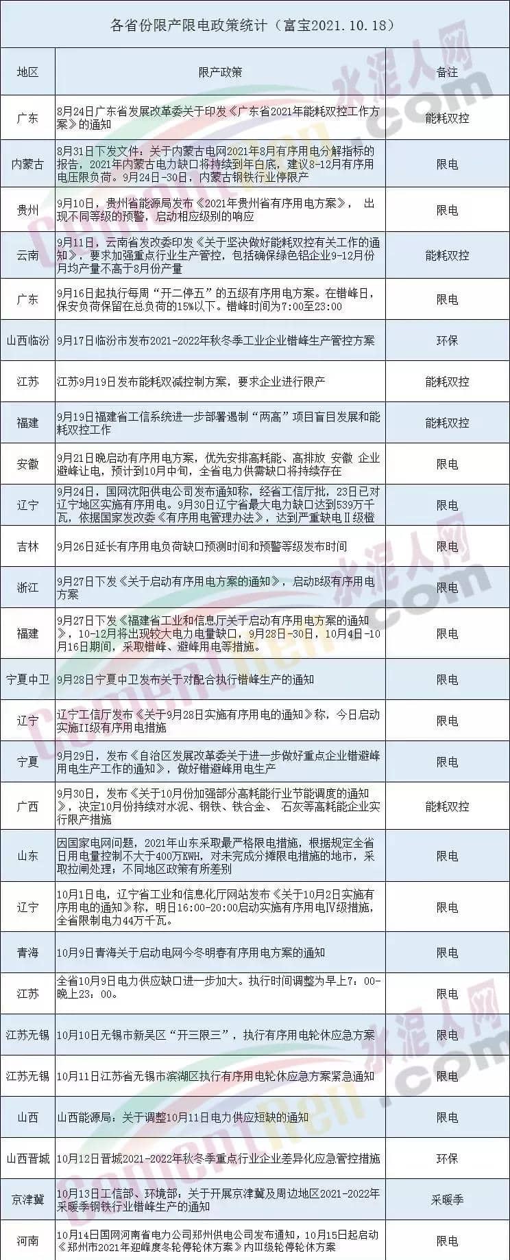 實際上,8、9月份就有部分地區出臺電價改革方案,例如貴州、廣東等省份先后發布通知,執行分時電價政策,在平段電價基礎上,上、下浮一定比例,形成高峰電價和低谷電價。目前限電最嚴的地區是河南,目前電爐已全部停產,長流程限產30%;長三角地區電力缺口仍有,但10月電爐廠并未大面積停產,以錯峰生產為主。