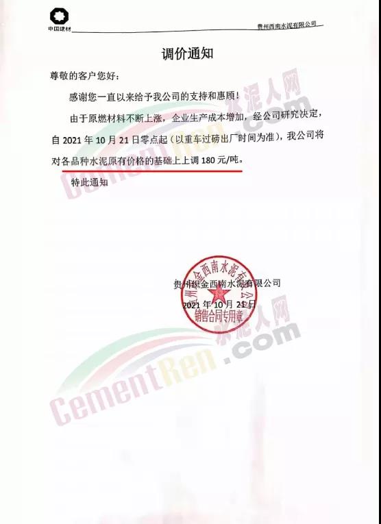 貴州織金西南水泥有限公司通知由于原燃材料不斷上漲,企業生產成本增加,經公司研究決定,自2021年10月21日零點起(以重車過磅出廠時間為準),公司各品種水泥上調180元/噸。?
