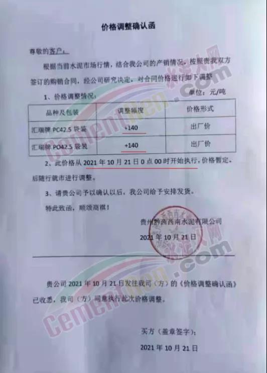 貴州黔西西南水泥通知根據當前水泥市場行情 ,結合公司的產銷情況,經公司研究決定自10月21日0時起對合同價格(出廠價)上調140元/噸。