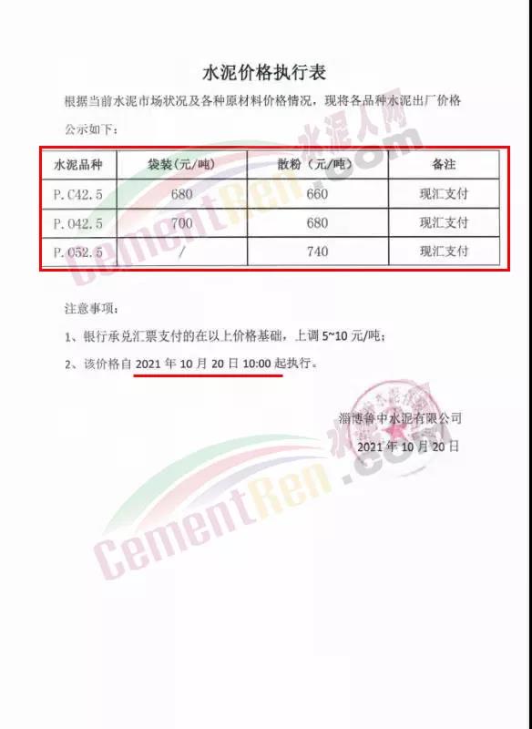 淄博魯中水泥有限公司通知,因近期水泥原燃材料價格持續上漲,加之限電、限產,造成物料產品緊張,從而導致公司水泥成本大幅提高,經公司慎重研究決定,自2021年10月20日10∶00起,公司各品種水泥銷售價格在現行價格基礎上上調130元/噸。對前期已經付款的部分,據情進行價格折算后,方可開單提貨。企業同期發布的水泥價格執行表顯示,P.O42.5散裝水泥、P.C42.5袋裝水泥報價均為680元/噸。